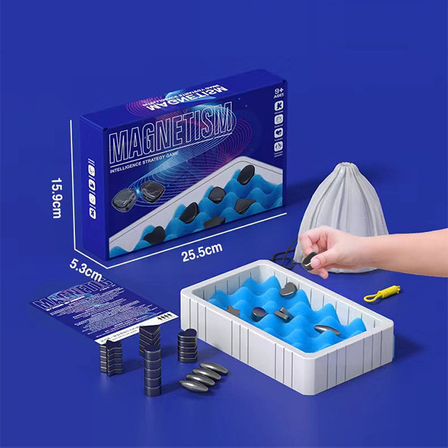 بازی شطرنج آهنربایی یا magnetic chess یا Magnetism متشکل از 20 مهره ی آهنربایی قوی در اشکال گوناگون و یک صفحه اسفجی و یک بند است. بین 2 تا 4 نفر قابلیت شرکت در این بازی را دارند مهره ها بین بازیکنان پخش می شود و به دو روش داخل برد اسفنجی بازی یا وسط بند میتوان بازی کرد، در روش برد اسفنجی بازیکنان باید مهره ها را به نوبت داخل فضای مشخص بگذارند ، هرچه بازی جلوتر برود و مهره های آهنربایی بیشتری در زمین بازی قرار بگیرند امکان جذب شدن مهره ها به هم وقتی بازیکنان مهره ی خد را روی زمین میگذارند بیشتر می شود اگر هنگام مهره گذاشتن توسط هربازیکن ، مهره یا مهره هایی به هم در اثر جاذبه ی آهنربایی بچسبند ، آن بازیکن باید همه مهره های به هم چسبیده را بردارد ، بازیکنی برنده است که تمام مهره های خود را بتواند بر روی زمین بگذارد و دستش خالی بشود. روش دوم بازی بوسیله یک بند که درون جعبه قرار دارد انجام میشود ، بند را بصورت یک حلقه به اندازه دلخواه روی یک سطح میگذارند و بازیکنان باید مهره های خود را درون حلقه بگذارند تا دستشان خالی شود مث روش اول . با کوچک کردن حلقه میتوان درجه سختی بازی را بالا برد
