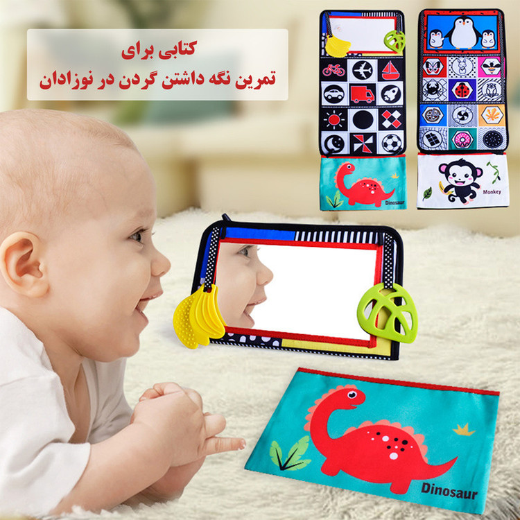 "کتاب ارچه ای آینه دار مدل تامی تایم Tummy Time نوعی کتاب است که به طور خاص برای نوزادان طراحی شده تا در زمان "روی شکم بودن" از آن استفاده کنند. زمان روی شکم بودن یا Tummy Time، دورهای است که نوزاد به صورت بیدار و تحت نظارت روی شکم خود قرار میگیرد. این زمان برای رشد نوزاد بسیار مهم است زیرا به تقویت عضلات گردن، شانهها، بازوها و تنه کمک میکند و همچنین از به وجود آمدن نقاط صاف روی پشت سر نوزاد جلوگیری میکند. این کتاب پارچه ای ویژگیهایی دارد که آن را برای نوزادان جذاب میکند، مانند: - تصاویر با کنتراست بالا: الگوهای و رنگهای روشن و سیاه سفید برای جلب توجه نوزاد. - مواد بادوام: ساخته شده از مواد مقاوم و ایمن برای نوزاد که میتوانند در برابر آب دهان و دستکاریهای خشن مقاومت کنند. - عناصر تعاملی: بافتهای قابل لمس، صفحه ی آینه ای ، دربهای بازشو و صداهای خرچخرچ برای تحریک حواس نوزاد. - طراحی استندی: این کتاب میتواند به خودی خود ایستاده باشد (به صورت مثلثی مثل تصاویر ) تا نوزادان بتوانند در حین روی شکم بودن یا نشستن به آنها نگاه کنند. این کتابها نوزادان را تشویق میکنند تا سر خود را بلند کرده و با محیط اطراف خود تعامل کنند که این کار باعث تقویت رشد جسمی و شناختی آنها میشود.