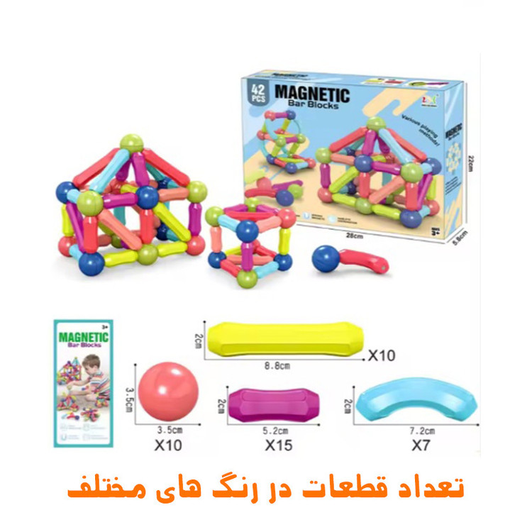 42 قطعه گوی و میله مغناطیسی و تعداد از هر کدام مطابق عکس کالا جسم خلاق و فضایی را به کودک میآموزد موجب افزایش تمرکز و قدرت حل مسئله موجب افزایش خلاقیت کودک می گردد دارای رنگ های شاد و متنوع است کمک به تقویت حافظه تقویت مهارت های حرکتی کودک
